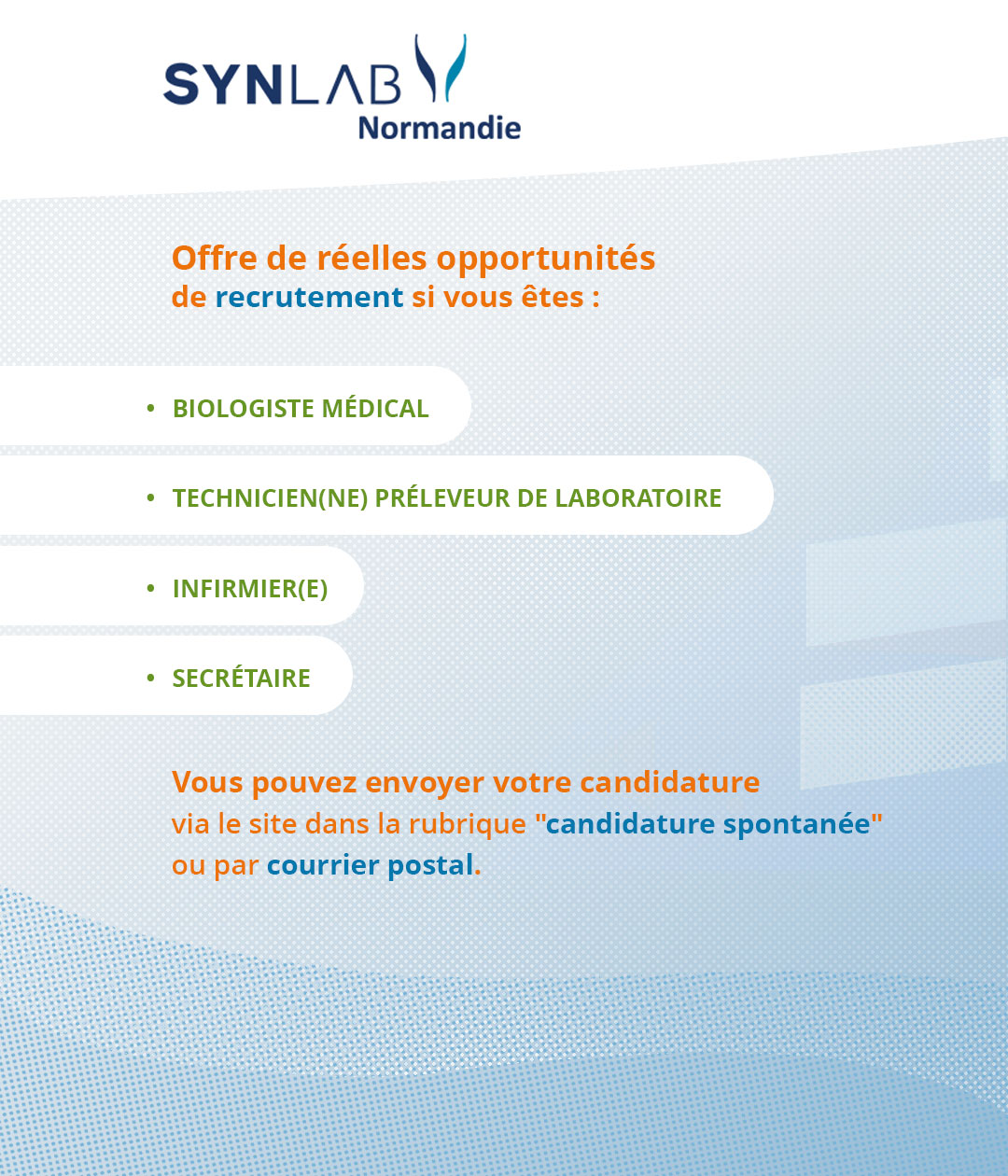 Synlab Normandie offre de réelles opportunités de recrutement : Vous pouvez envoyer votre candidature via le site dans la rubrique "candidature spontanée" ou par courrier postal.